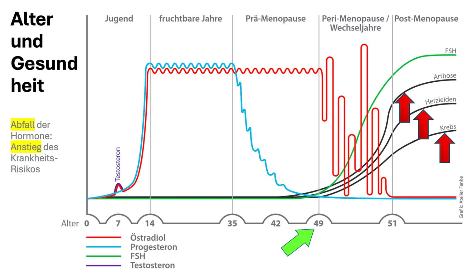 - Typische Beschwerden: Trockenheit der Schleimhäute, Osteoporoserisiko, Muskelschwund, Hautalterung, kardiovaskuläre Veränderungen